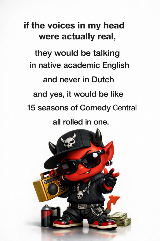 Yes! That would make a lot more sense. If the voice in my head would be talking academic English in a respectful tone without any male masculinity perspective. But seeing it spoke to me in Dutch about stuff, I have absolutely no interest about. It was kind of iffy to begin with.