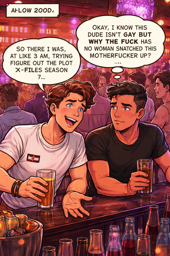 Setting: A lively, dimly-lit gay bar in the year 2000. Neon lights flicker, the jukebox hums in the background, and the sounds of laughter and chatter fill the air. The place has a relaxed, fun atmosphere, with a lot of people mingling and enjoying the night. It’s the kind of bar where everyone feels free to be themselves, and where the ‘90s optimism still lingers despite the turn of the century.