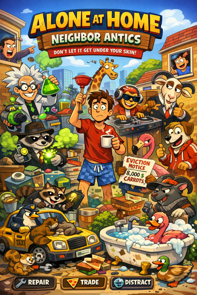 Alone at Home is a cartoon puzzle-life comedy franchise about teenagers entering adulthood while living alone in a world where neighbors and animals create escalating chain-reaction chaos.